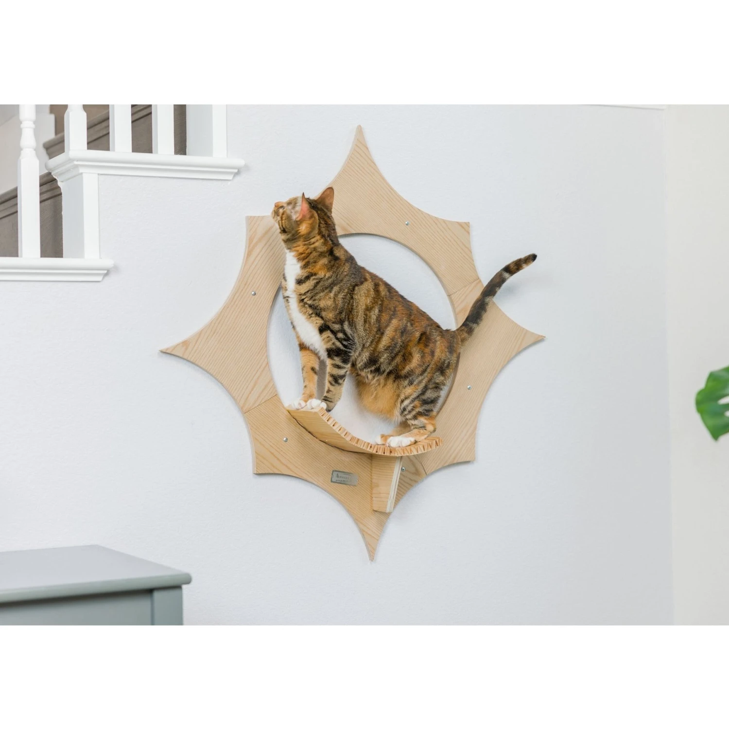 - Sun-shaped cat shelf made of solid poplar layered wood.