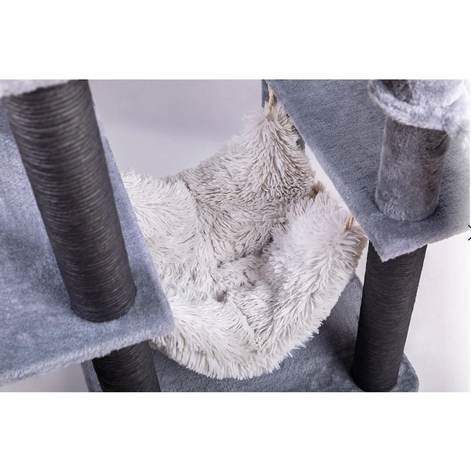 Keep your kitties busy with the Catry Interactive 7-Level Cat Tree with Cat Condo, Scratching Posts, and Cat Toys! This seven-level modern cat tree is purr-fect for multi-cat homes. Each tree comes with two faux fur beds and a deep hammock for warm, cozy naps. Your cats can hide out inside the condo, or let it all hang out in the side hammock! The recycled paper rope scratching posts help keep nails trim and healthy. Plus, the dangly sisal rope and pom-poms will keep your puddies entertained for hours!