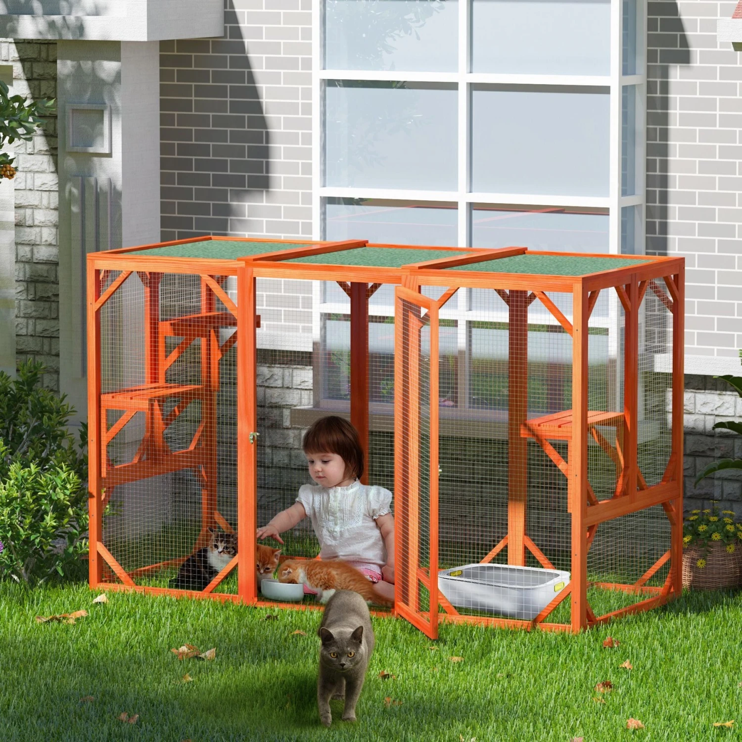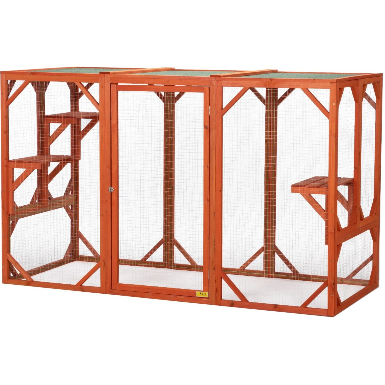 Let your fine feline friend experience the joys of the outdoors within the safety of an elegant outdoor enclosure with Coziwow by Jaxpety Wooden Outdoor Cat furniture. Crafted with sturdy yet stylish pine wood and encased with galvanized, rust proof wires, this functional cat house is equipped with a door that easily latches for easy access and security. The flat top roof is coated with weatherproof asphalt that protects your pal against sun and rain, so there’s no need to put a rain delay on playtime. Plus, this luxuriously spacious cattery has three nonslip, wooden platforms and plenty of room for toys, beds, and towers—so your kitties can get some beauty sleep or get some exercise to their heart’s content. This cattery gives your fur babies a 360-degree view of the outdoors and is easy to assemble as well.