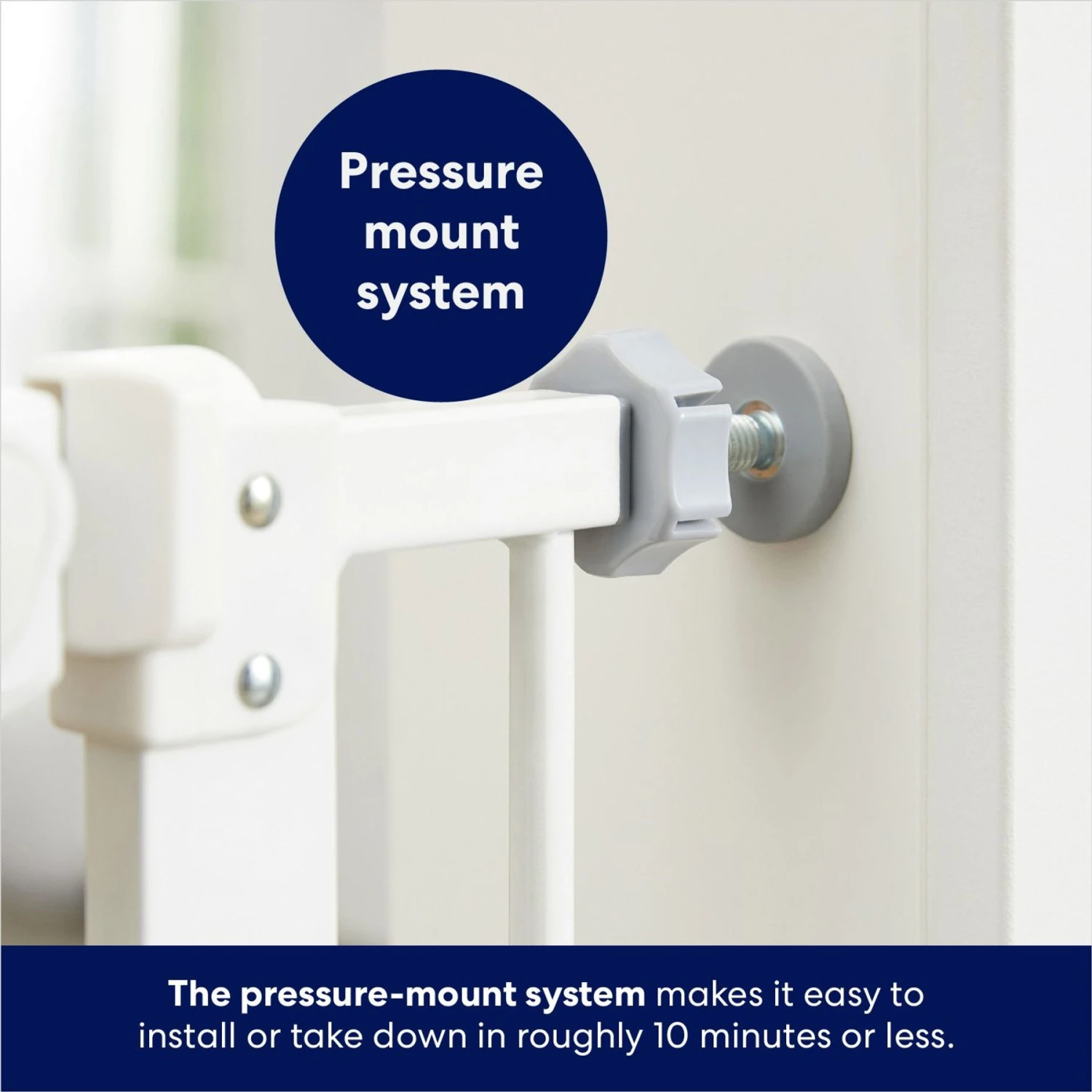 Check out the Size Tab to be sure this gate fits your doorway. Turn any room in the house into a safe zone for your pet with this extra-tall gate from Frisco by Chewy. Made with a durable all-steel construction, this gate is designed to keep your pet safely contained by simply installing it in a door frame or hallway. The pressure-mount system makes setting it up and taking it down easy, so you can move it to different areas of the house needed. The gate door works double duty by staying open when you need it to—just open it past 90 degrees to lock it open—or otherwise closing on its own. You can also set up the door to open to any side. The dual-lock safety release means your pal can’t get crafty and open the door, adding a layer of security. Plus, this gate is lightweight so you can transport it and store it easily.