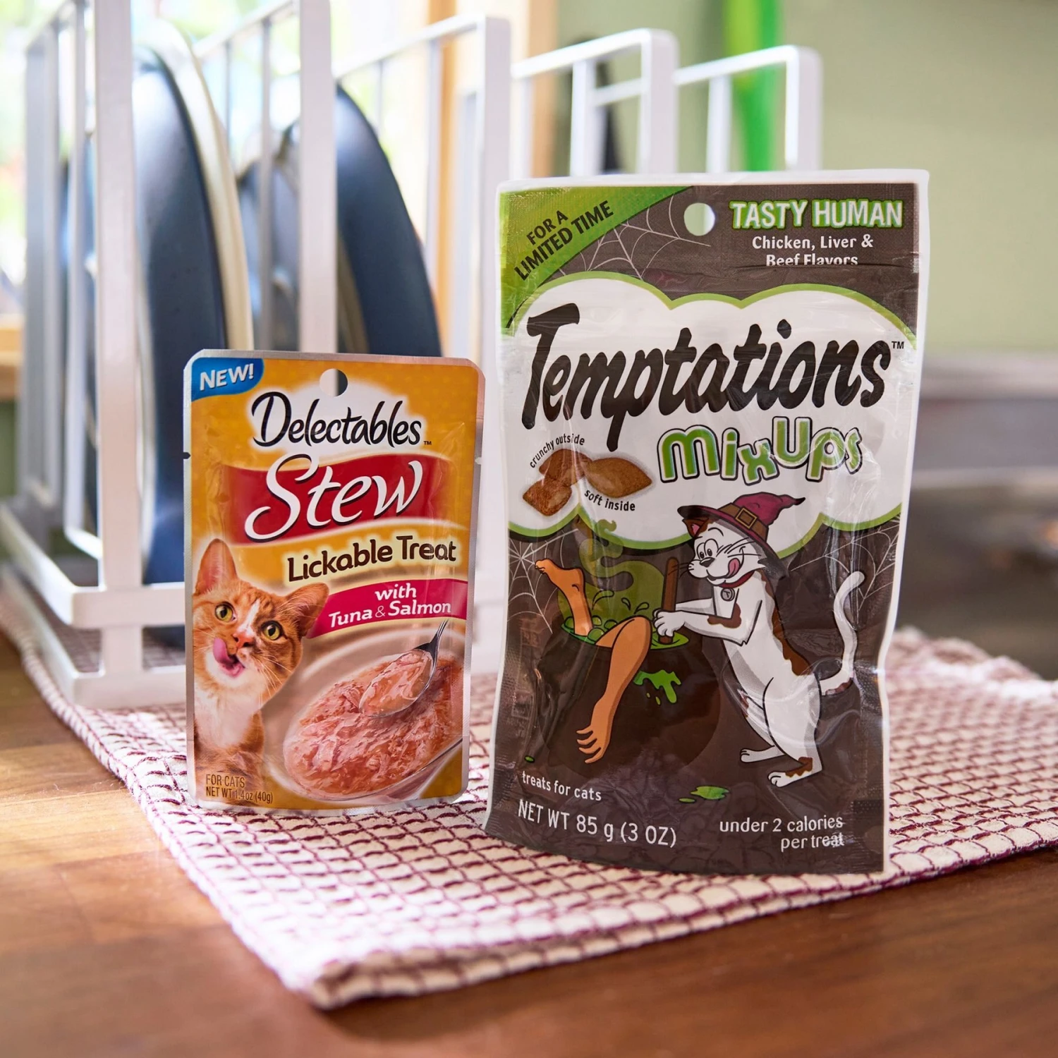 Hartz Delectables Stew Tuna & Salmon Pack Lickable Cat Treats, 1.4-oz pouch, 12 count; Temptations MixUps Tasty Human, Chicken, Liver & Beef Flavors Soft & Crunchy Cat Treats, 3-oz bag; Frisco Halloween Plush & Springs Variety Pack Cat Toy with Catnip, 3 count; Frisco Halloween Whimsical Trick or Treat Pop-Up Tent Cat Toy with Catnip; Frisco Halloween Cutie Bat Plush Cat Toy with Catnip