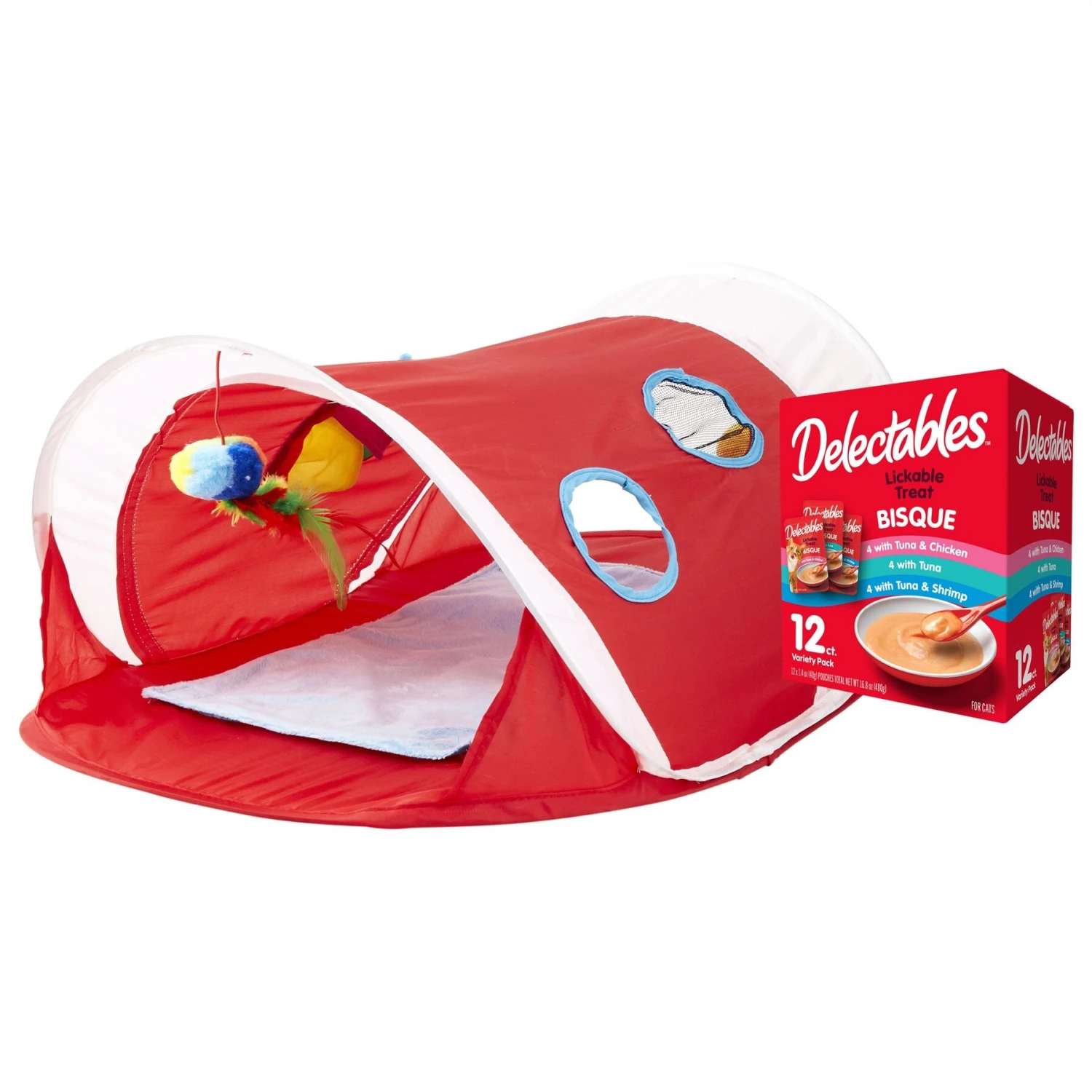 Treat your kitty to the best of both land and sea with Hartz Delectables Bisque Variety Pack Lickable Cat Treats and Hartz Just For Cats Peek & Play Pop-Up Tent Cat Toy. Included are 12 Bisque packets in three different recipes—Tuna & Chicken, Tuna, and Tuna & Shrimp. Hartz Bisque recipes offer a smooth texture that’s sure to please the finickiest felines. Simply open the pouch, pour it into a bowl, and let him enjoy the rich reward as a snack between meals or as a tasty kibble topper. Pop the tent right out of the box and let your kitty dive into this unique activity center that doubles as a play “cave” and nap “den.” It features two hanging toys for swatting, holes for peeking, and a detachable crinkly mat for scratching. Your kitty will love spending time in his tent, and you can even join in on the fun, too! It’s great for solo or interactive play and adds much-needed mental stimulation and exercise to keep your little hunter healthy.