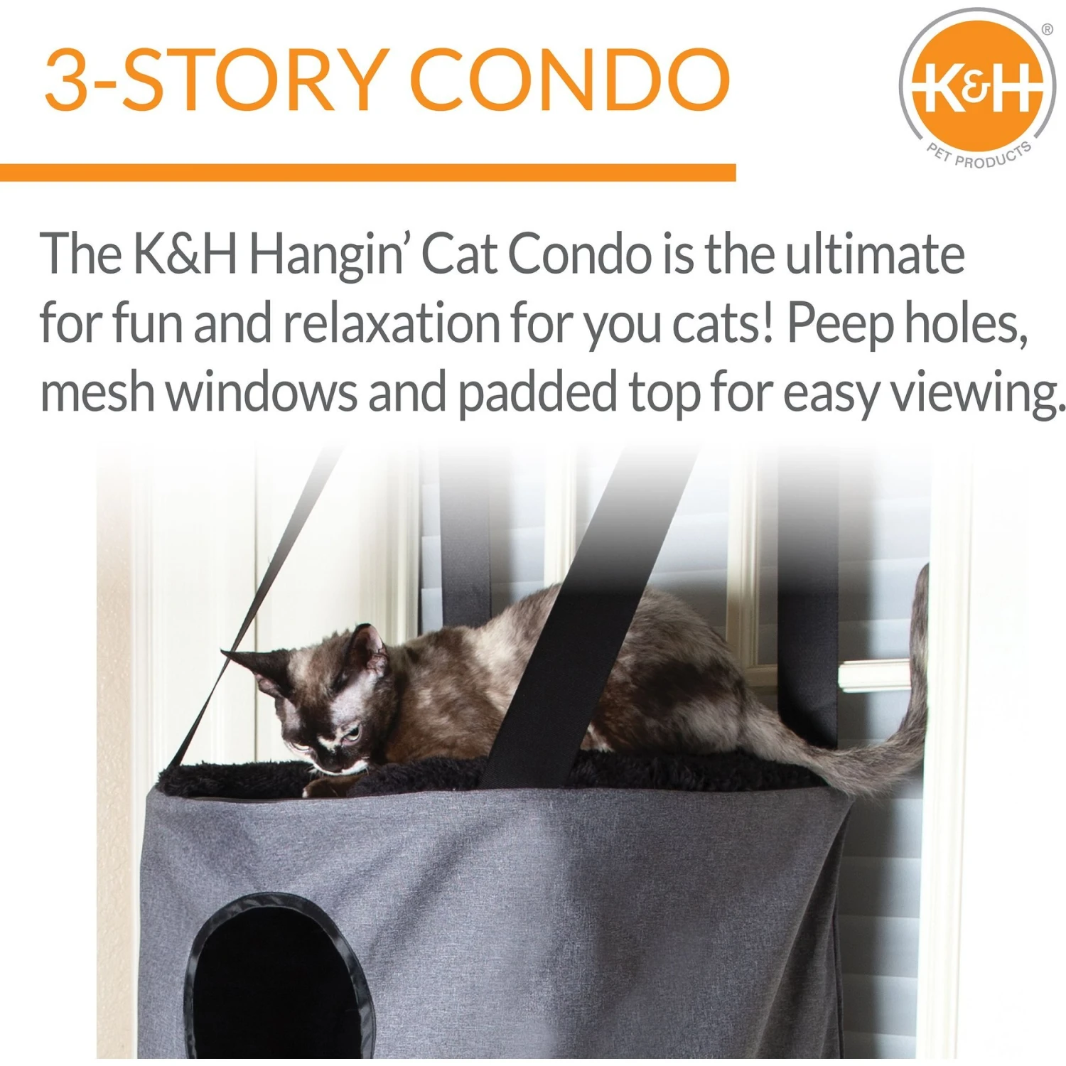 The K&H Pet Products Hangin’ Multi-Story Cat Condo is designed to be your feline friend’s favorite place to hang out and have fun. The clever space-saving design attaches to any door so it doesn’t take up floor space. Top and bottom straps securely lock the condo in place and provide peace of mind during moments when kitty feels extra frisky. Mesh windows let your fur-iend watch what’s happening down below. When it’s time for a cozy cat nap, there are plenty of comfy places for dozing.