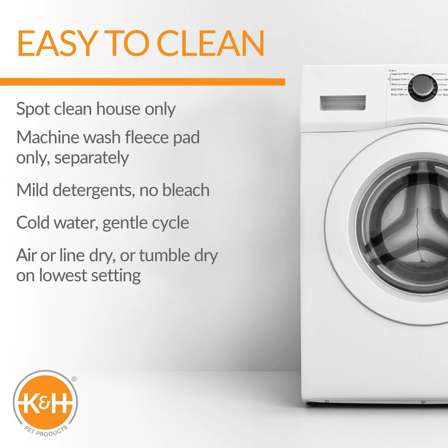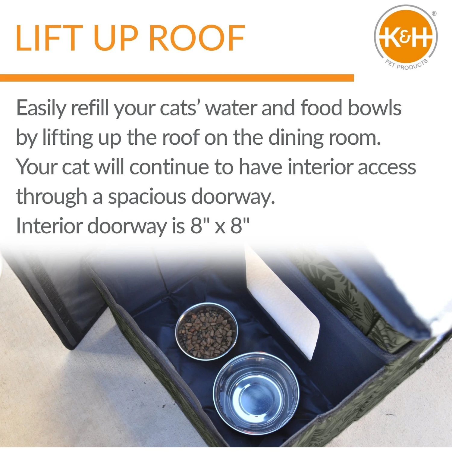 Give your kitty her very own abode with the K&H Pet Products Unheated Two-Story Kitty House. This kitty house includes two bedrooms with four removable door flaps, and a cat dining room. The dining room has a removable roof so that you can treat your feline friend to food and water, and a large doorway for your cat to enter and exit. The second floor has space for a kitty roommate, and also has a great view. The house is made with a nylon, vinyl-backed fabric to help shield your cat from harsh weather, and the first floor includes a cozy fleece pad. Plus, no tools are required for assembly!
