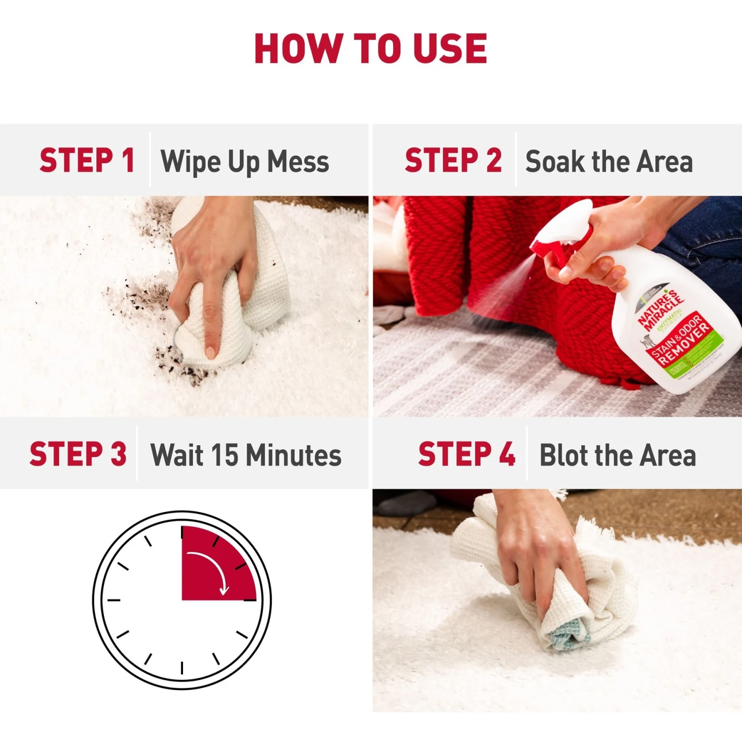 Nature’s Miracle Just for Cats Stain and Odor Remover Spray is tough on cat urine, feces, vomit, drool and other organic stains and odors. The bacteria-based formula produces enzymes to target spot stains and odors while freshening with a light citrus scent. When used as directed, it’s safe to use on carpets, hard floors, furniture, fabrics and more—because curious cats can get into just about anything. Plus, the ready to use spray bottle helps you get to work right away.