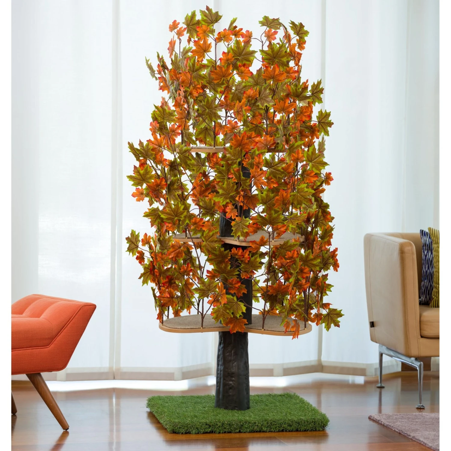 - This Luxury Cat Tree is designed not only for your cat’s comfort and entertainment but for yours as well—the sleek, curved cat perches and faux leaf design will bring a bit of the outdoors inside.