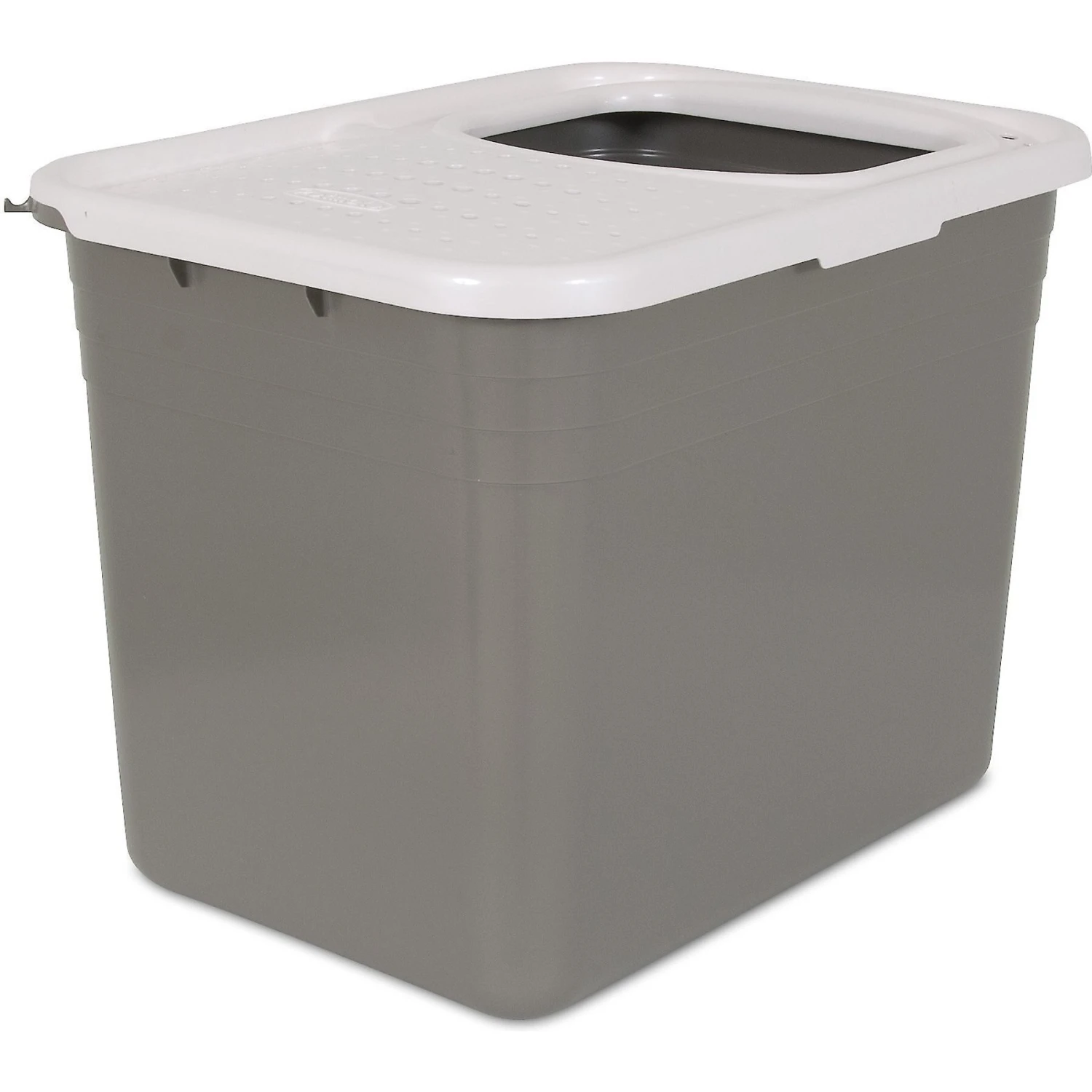 The Petmate Top Entry Litter Pan keeps litter inside the box, where it belongs. A wide top opening allows easy access for your cat, and the space inside is large enough for her to turn around. No matter how much she digs or paws through the litter, the high walls will keep it from spilling over the edge and onto the floor. And in multi-pet households, they’ll keep out curious doggy noses. When kitty jumps out, the litter is trapped by the non-slip, textured lid and then falls back into the pan through grates that are large enough for most litter types. The rounded edges and molded bottom handle help you lift the box easily, even when it’s full of litter. Plus, there’s a built-in hook for hanging a litter scoop. The Petmate Top Entry Litter Pan is made in the USA from 95% pre-consumer recyclable materials, making it an eco-friendly litter box option.