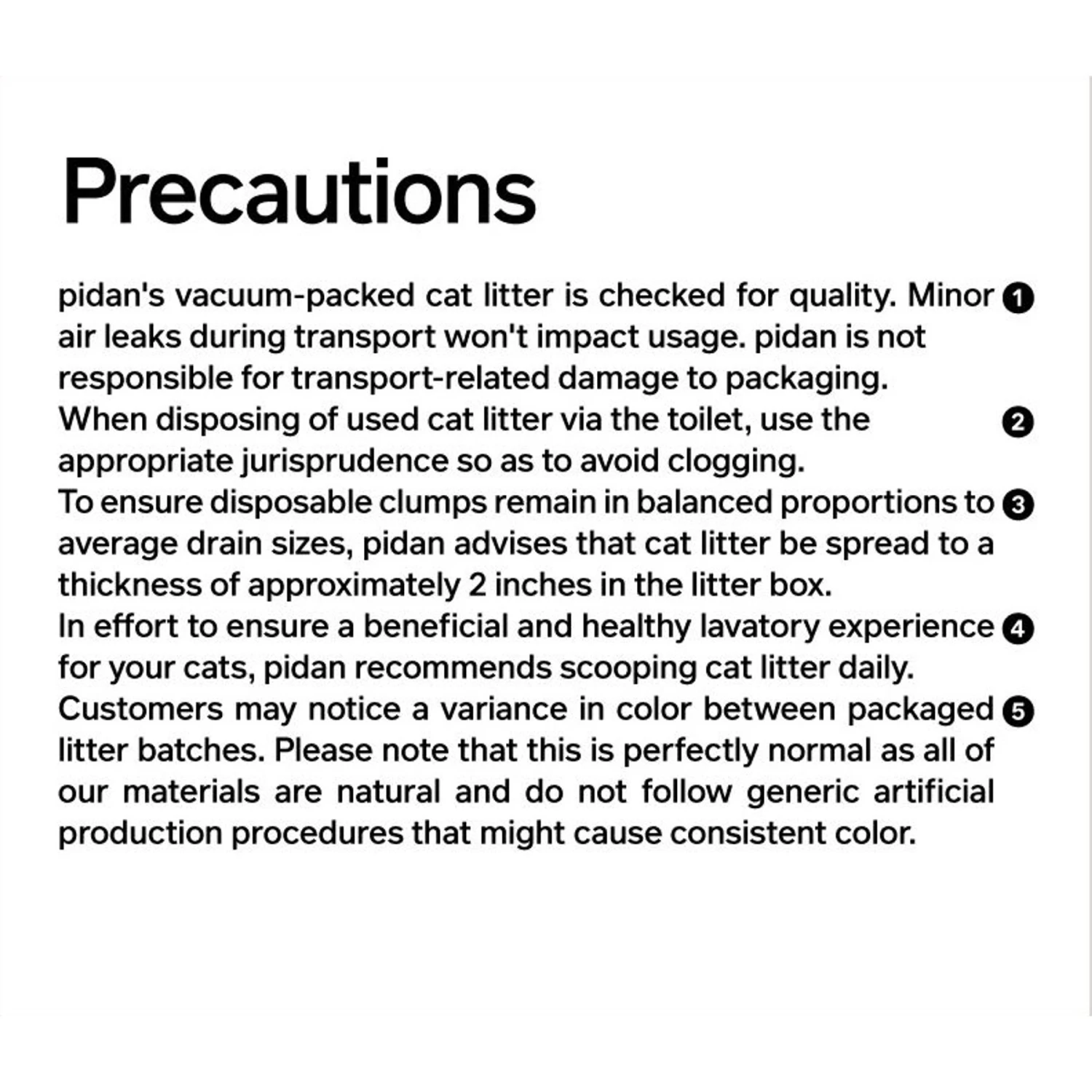 (1) Minor air leaks of vacuum package during transport won’t impact usage(2) When disposing of used cat litter via the toilet, use the appropriate jurisprudence so as to avoid clogging. (3) To ensure disposable clumps remain in balanced proportions to average drain sizes, Pidan advises that cat litter be spread to a thickness of approximately 2 inches in the litter box.(4) In effort to ensure a beneficial and healthy lavatory experience for your cats, Pidan recommends changing cat litter daily.(5) Customers may notice a variance in color between packaged litter batches. Please note that this is perfectly normal as all of our materials are natural and do not follow generic artificial production procedures that might cause consistent color.