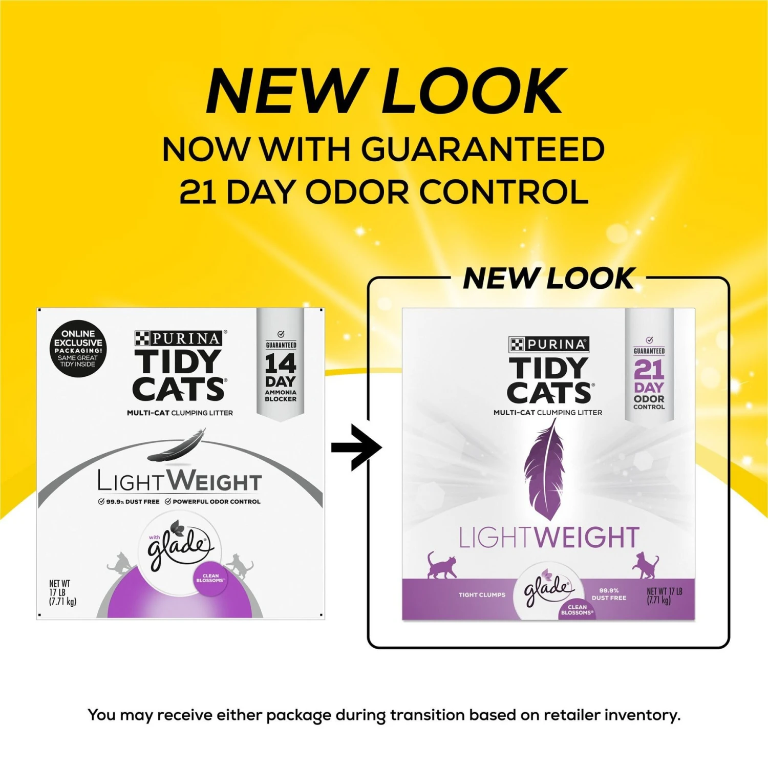 Bring a touch of springtime indoors with Purina Tidy Cats LightWeight With Glade Clean Blossoms Clumping Multi Cat Litter. This lightweight cat litter stops ammonia, urine and fecal odors in their tracks, keeping each litter box smelling nice. A powerful Ammonia Blocker prevents ammonia odor from forming for 14 days when used as directed. Even better, the scented cat litter leaves behind a fresh fragrance and makes litter care a snap! At less weight than leading clumping cat litter, this lightweight litter is easy to carry, pour and store. It forms strong, tight clumps for easy scooping, and the low dust clumping cat litter pours cleanly into the cat box. This odor control cat litter with Glade Clean Blossoms stands up to regular use by all your feline family members and wows with moisture-locking technology that keeps them dry and comfy. With this powerful odor control clay cat litter, you can get back to the important stuff—spending more fun time with your favorite felines.