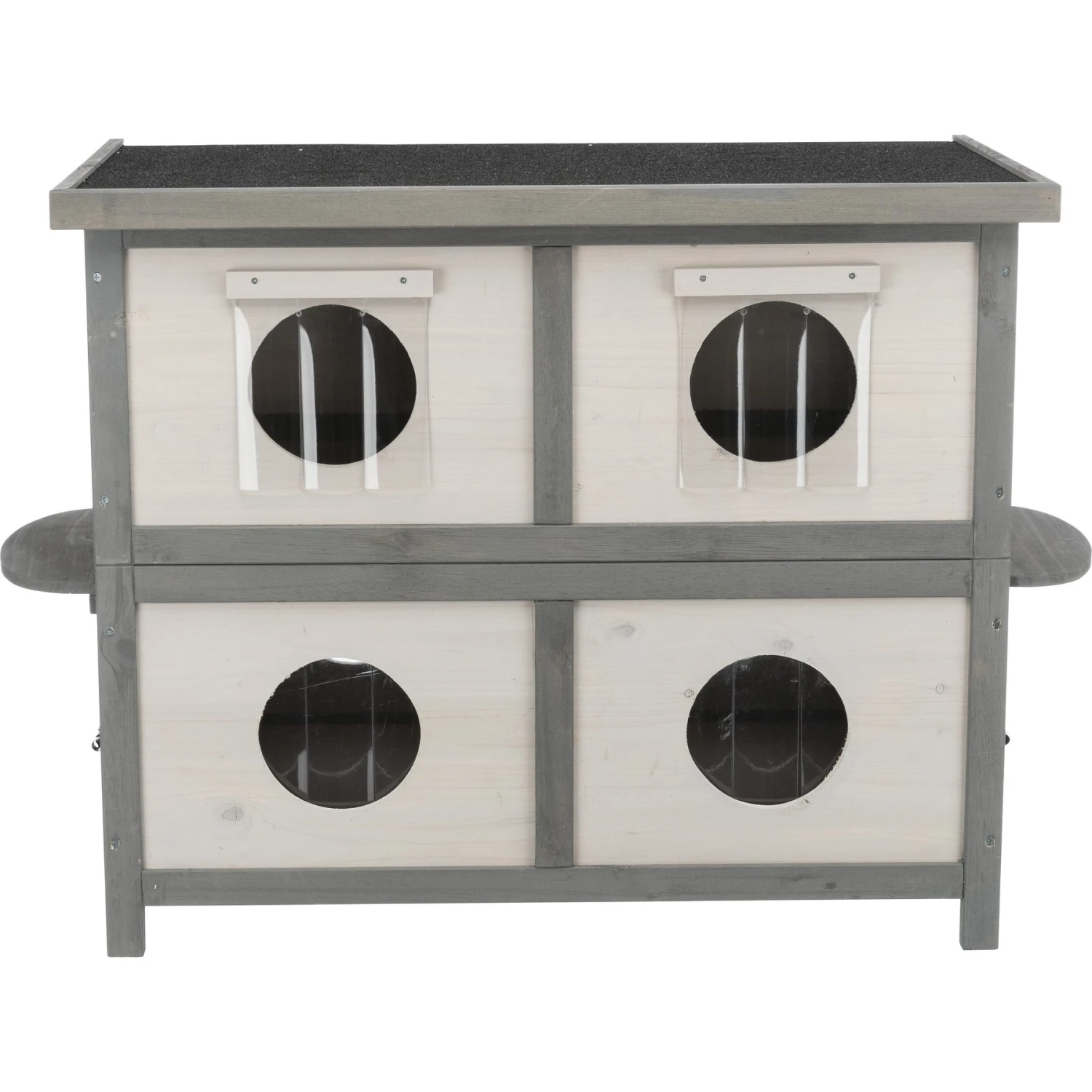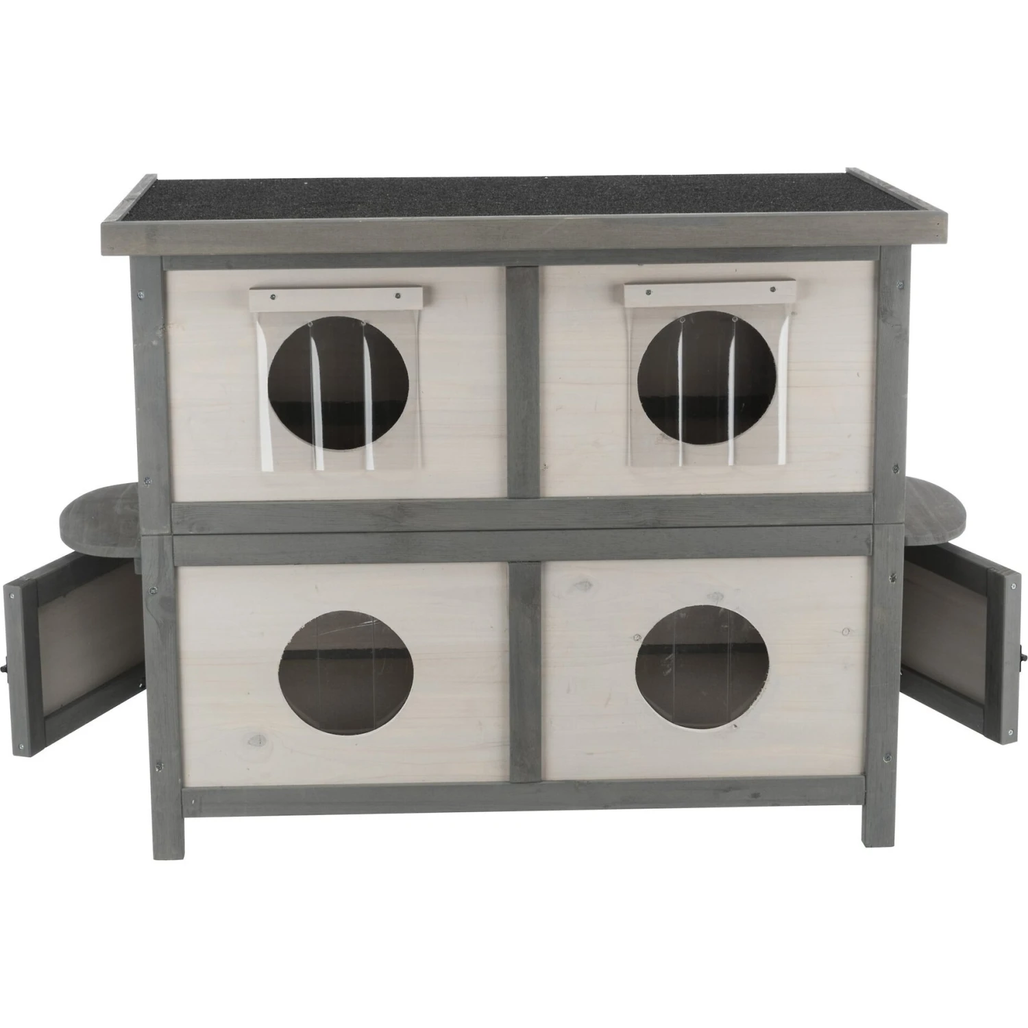 The Trixie Natura Wooden Cat House is the purr-fect escape for any kitty looking for shelter. This outdoor style house is crafted from a durable non-toxic fir wood so it stays strong through many years of use. Whether your home is frequented by feral cats or you have multiple feline friends who prefer to live outside, this spacious design offers four compartments and plenty of room for more than one cat. The house protects from the cold and wet elements and features a separate entry and exit system with escape doors in case a predator animal tries to get in.