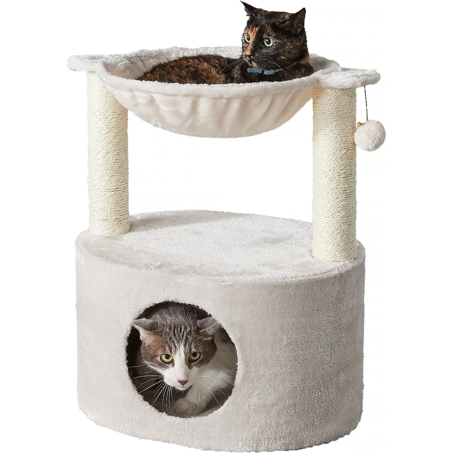 The Two By Two The Holly 23.6-in Plush Cat Tree & Condo is purr-fect for both playtime and nap time. The oval condo base creates a cozy hideaway, while the middle platform is a paw-some place to perch. A plush hammock on the top is sure to become your furbaby’s favorite cat nap spot. This cat tree is ready for playtime, too––an attached ball and sisal-wrapped columns help to keep kitty’s claws occupied. The condo takes up minimal floor space and its neutral color matches home decor, so it’s ideal for apartments and condos as well as larger homes.