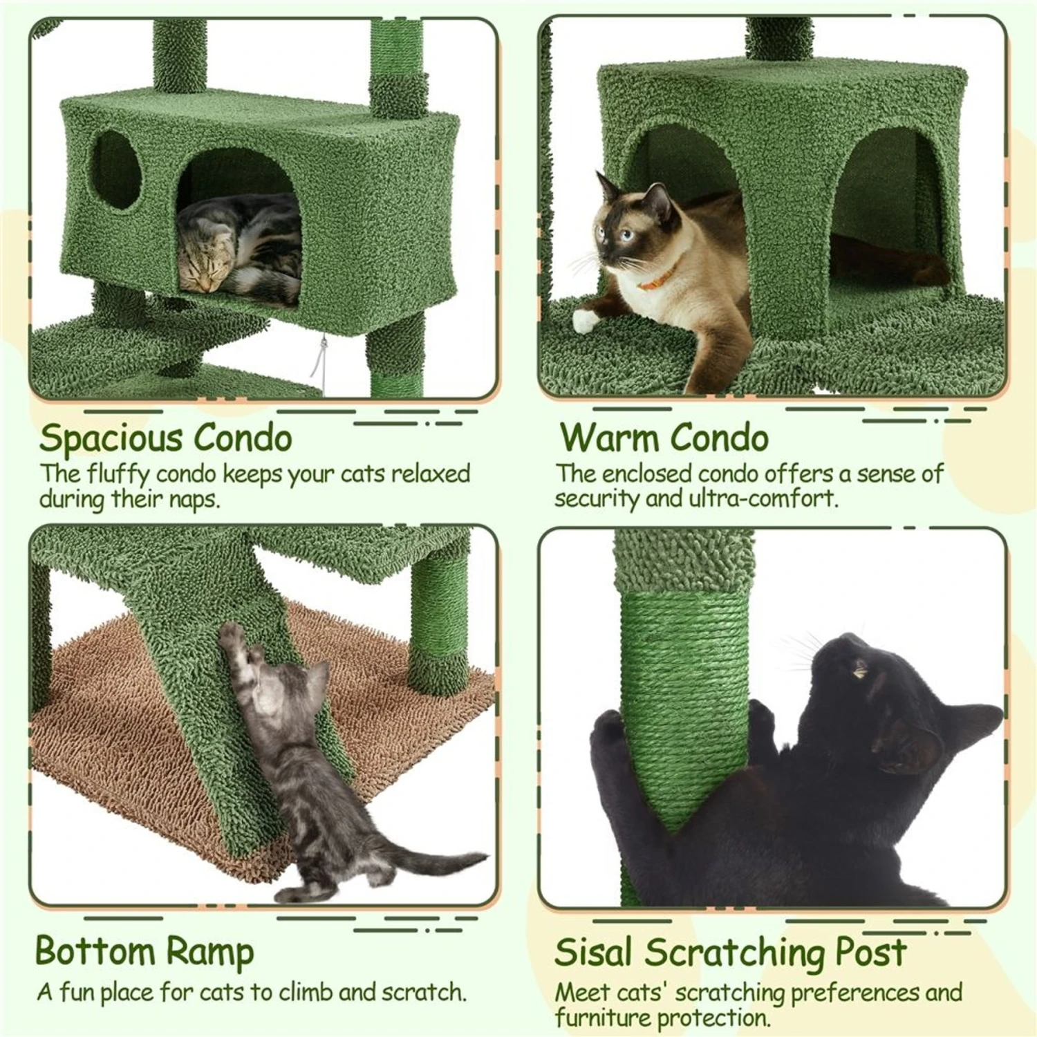 Give your favorite felines their own purr-sonal space with the Yaheetech Cactus Cat Tree. This vibrant green and brown, cactus shaped cat tower is inspired by gorgeous desert vistas and made with safe and sustainable materials. Your furry friends can relax, nap and play on the cozy cat condos, the comfy perch, the round platform, the ramp and the hanging ball. Designed for two or three small to medium-sized cats, this cactus cat tree is a great spot for your pets to scratch, climb, jump and have fun. Paw-fect for households with multiple cats.