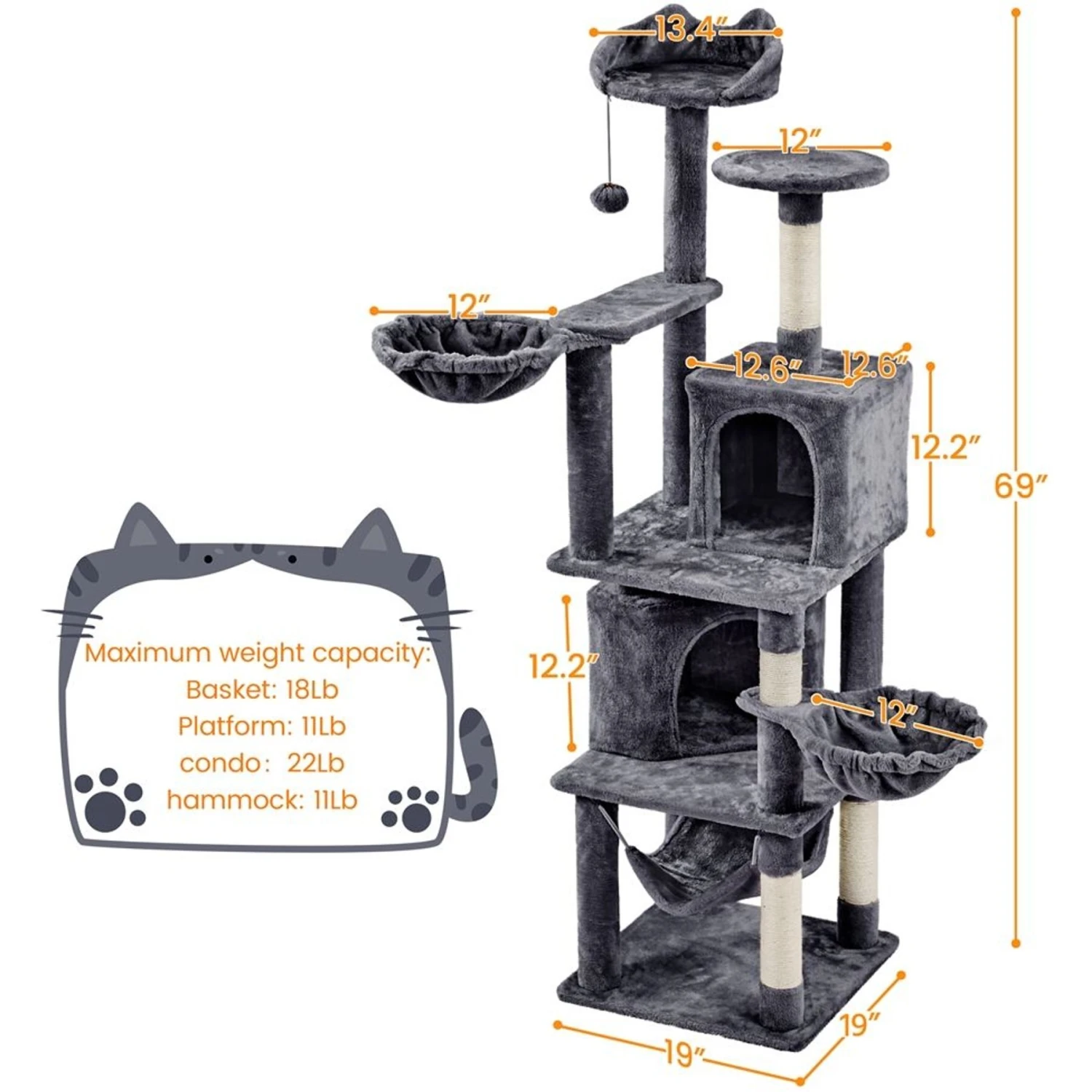 Give your cats a fun space to call their own with the Yaheetech 69-in 4-Level Plush Cat Tree. This multi-level cat tree is constructed of particle board, skin-friendly plush and natural sisal rope for a cat-friendly and comfy play and nap space. Multiple scratching posts help encourage positive scratching habits and help protect your furniture from scratchy claws. With two plush perches, two warm and fluffy cat condos, four sisal scratching posts, plus hammocks and baskets, your kitties will never be bored with this cat tree!