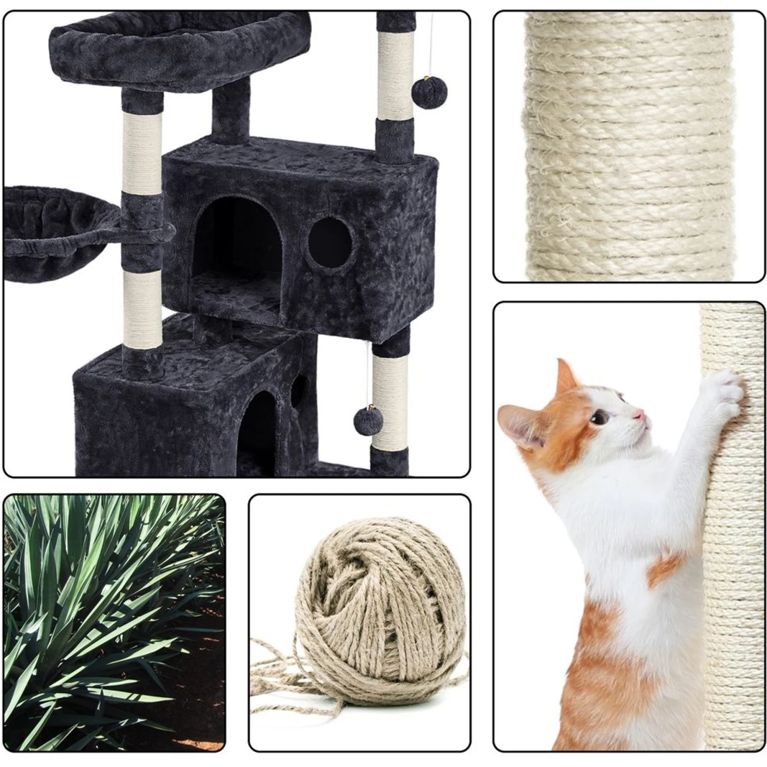 - Includes two platforms, a basket, two condos with windows, six scratching posts and two furry balls.
