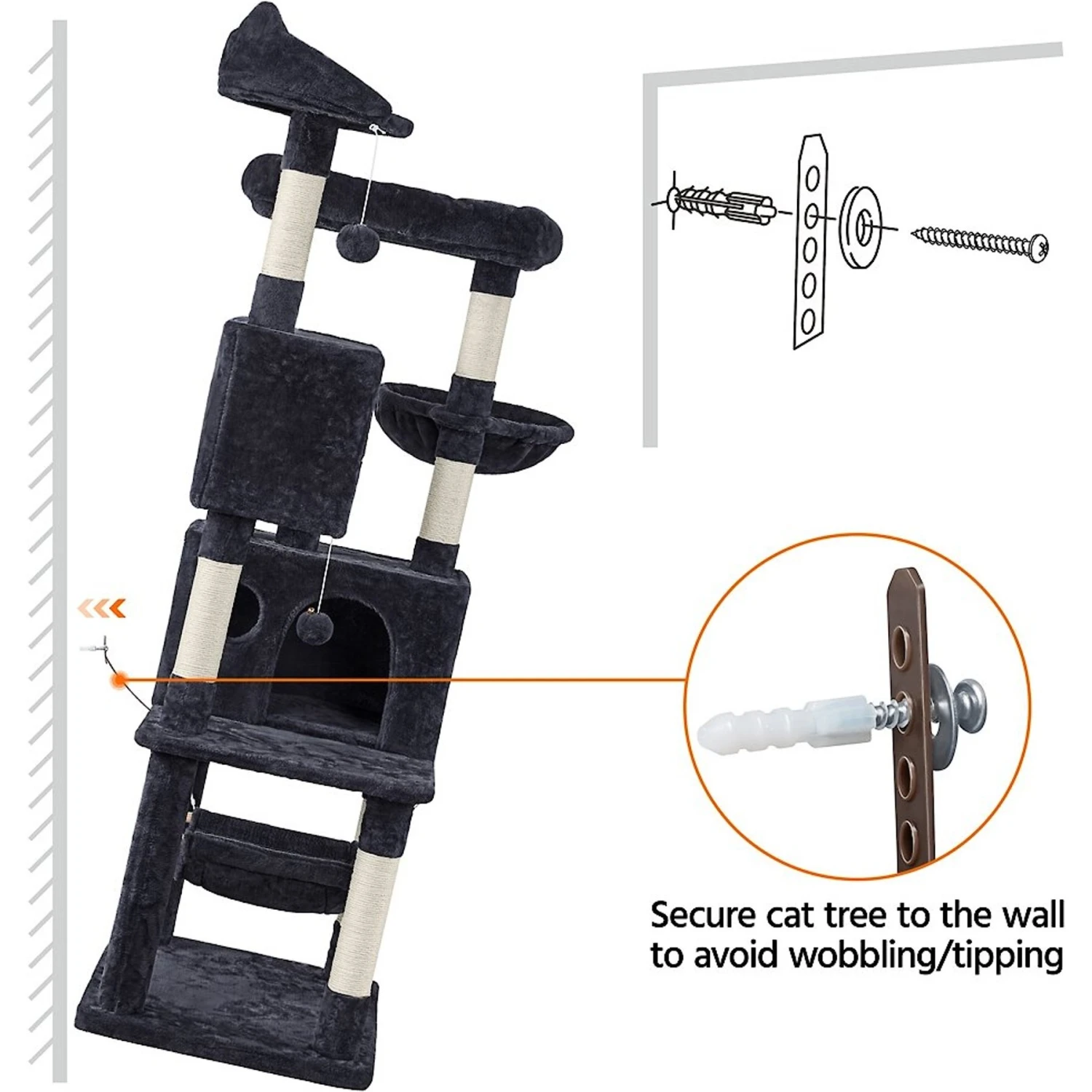 The Yaheetech 64.5-in Multi-level Cat Tree has everything your feline friend’s heart could desire! This cat tree features multiple tiers and structures for your kitties to play and lounge. It includes two platforms, a basket, two condos with windows, six scratching posts and two furry balls. It even helps keep your kitty’s claws away from your furniture! This cat tree is crafted with a soft covering so that your cat has a comfortable place to chill out. Plus, it comes with a strap attached, which can be used to fasten the tree to a wall.